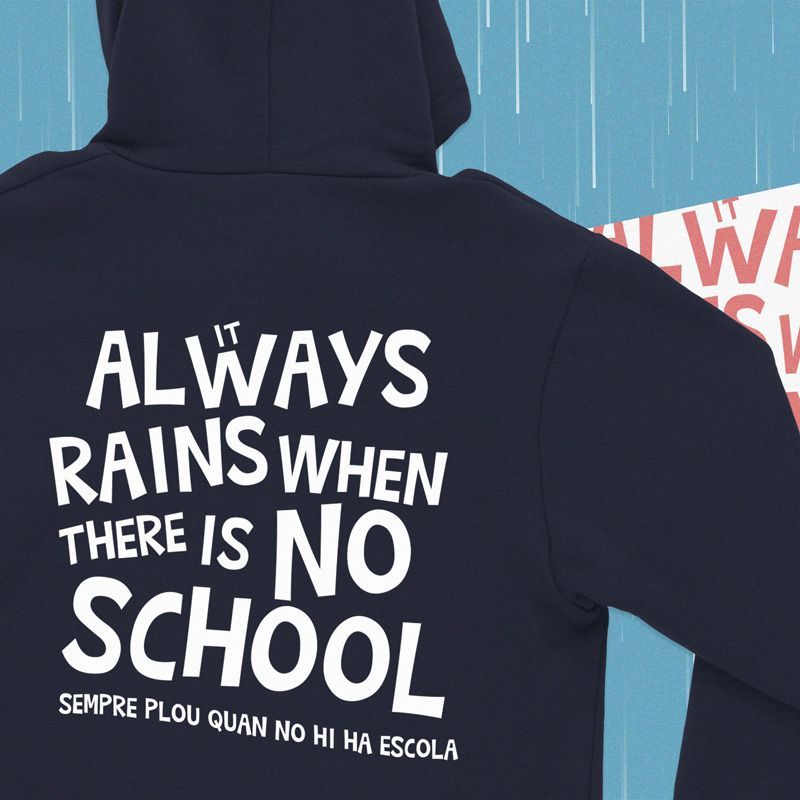 Dessuadora SEMPRE PLOU QUAN NO HI HA ESCOLA. Feta 50% cotó / 50% poliester, de 280g/m².